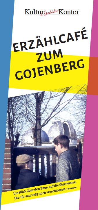 Kindheitserinnerungen, vertraute Plätze, bekannte Personen und interessante Erlebnisse am Gojenberg – im Erzählcafé des Kultur- & Geschichtskontor Bergedorf soll es genau darum gehen. Gemütlich beim Kaffeetrinken kann ausgetauscht, zugehört und erzählt werden. Auch Fotos vom Gojenberg sind jederzeit willkommen. Thomas Schramm, selbst am Gojenberg aufgewachsen und später lange Jahre an der Sternwarte tätig, führt durch den Abend und erzählt auch selbst von seinem Leben am Gojenberg.